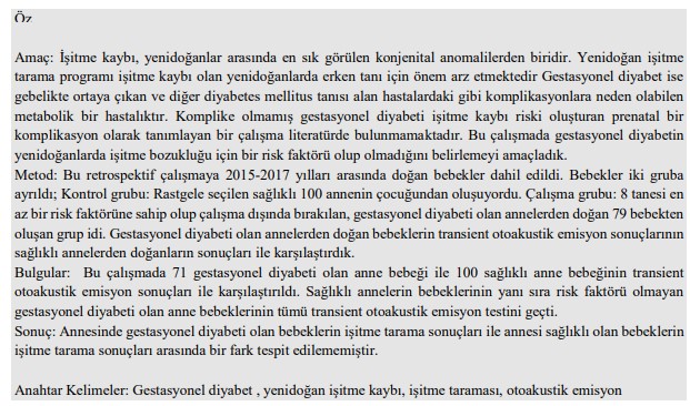 Amaç: İşitme kaybı, yenidoğanlar arasında en sık görülen konjenital anomalilerden biridir. Yenidoğan işitme tarama programı işitme kaybı olan yenidoğanlarda erken tanı için önem arz etmektedir Gestasyonel diyabet ise gebelikte ortaya çıkan ve diğer diyabetes mellitus tanısı…