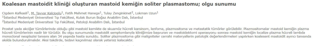 Prostat yada akciğer tümörlerinde olduğu gibi mastoid kemikte de skuamöz hücreli karsinom, lenfoma, plazmositoma ve metastatik tümörler görülebilir. Makalenin tamamı için tıklayınız
